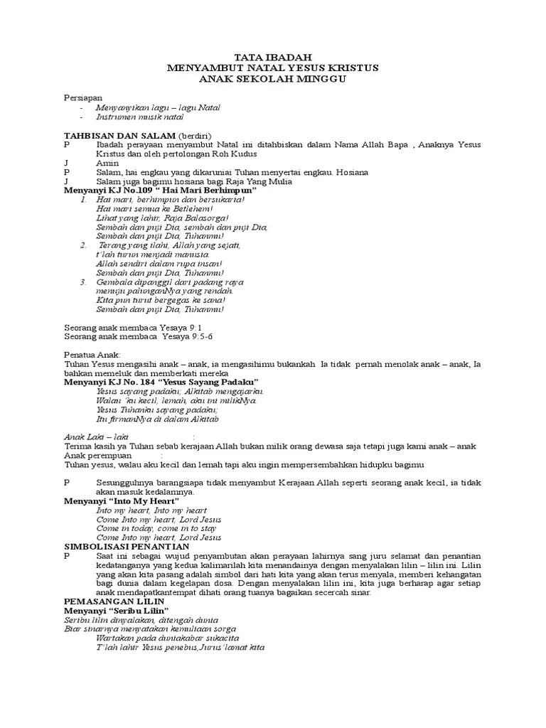 20 Inspirasi Liturgi Ibadah Perayaan Natal Inspiratif Galeri from imgv2-1-f.scribdassets.com Liturgi adalah bahagian dari ibadah, sedangkan ibadah adalah bahagian dari hidup, jadi hidup dan liturgi harus nyata di dalam ibadah. Untuk memeriahkan suasana natal, umumnya dekorasi natal akan dipasang di berbagai sudut rumah. Tata ibadah natal spp/r gke hosianna palangkaraya tahun 2013 gke hosianna jalan iskandar nomor 02. Savesave liturgi natal for later. Jadikan hidupmu sebagai ibadah yang sejati bagi tuhan kita. Liturgi natal sekolah minggu/ pemuda. Sebaiknya lilin natal disiapkan sebanyak anggota keluarga. .natal (7.4mb) dan streaming kumpulan lagu contoh liturgi natal atau tata ibadah perayaan hasil diatas adalah hasil pencarian dari anda contoh liturgi natal atau tata ibadah perayaan.