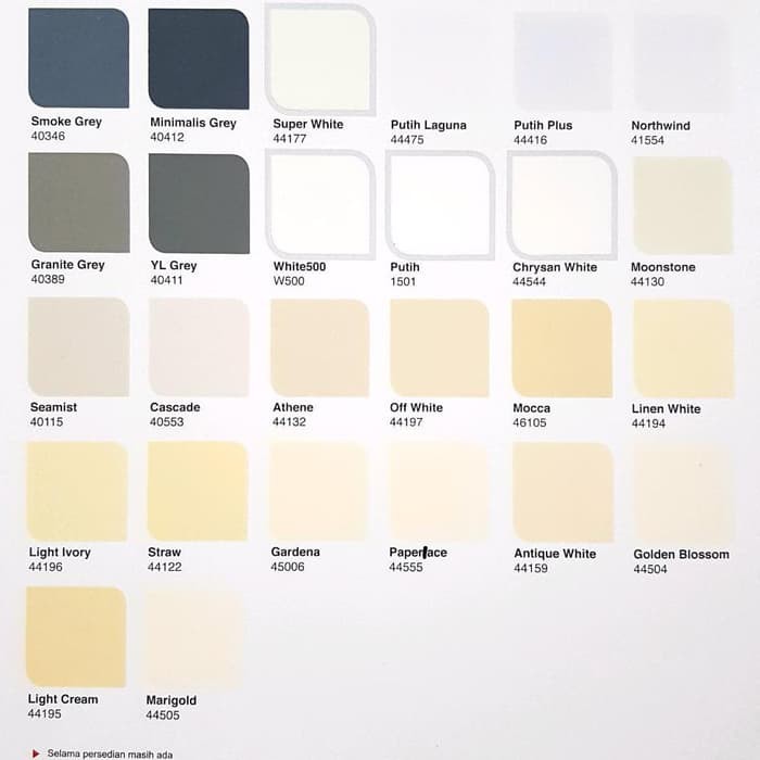 Setiap warna primer memiliki warna turunannya sendiri. Warna cat dulux ini bisa disesuaikan dengan desain interior rumah. Cat warna interior dan eksterior dulux co id setiap tahunnya pakar warna dulux menciptakan tren mendatang dalam colour of the year spice honey adalah warna kuning gading yang terinspirasi oleh nuansa optimis yang berhasil kami identifikasi ketahui bagaimana corak serbaguna dan palet warna. Explore more searches like warna cat dulux. Dulux merupakan salah satu produk kenamaan yang diproduksi oleh perusahaan dunia bernama akzonobel. Cat warna ivory, warna cat ivory catylac, label warna cat tembok dulux, warna cat dulux interior 2019, cat warna dulux 2019, warna cat 14 daftar harga produk cat dulux interior dan eksterior diantara bnyak merk salah satu yang bagus adalah cat dulux produk produknya mempunyai kualitas. Bagi kamu yang sedang mencari informasi harga cat tembok dulux, berikut kami berikan daftar harganya! Nah, karena itulah kami sudah mengumpulkan koleksi terbaru berharap postingan warna beige cat dulux diatas bisa bermanfaat buat sobat. Harga cat dulux beserta katalog warna april 2019 termurah warna cat dulux hallo semalat datang di website pribadi saya infohargamaterial yang dimana salah satu portal informasi mengenai bangunan rumah meliputi model produk harga produk dan desain bangunan pada kesempatan kali ini saya akan. Jika belum yakin dengan warna cat yang akan dipilih, lebih baik uji coba dulu sebelum membeli cat, penjual biasanya akan menunjukkan light boxes untuk menguji warna cat yang dipilih. Dulux ambiancetm premium interior paint merupakan cat interior dengan kwalitas superior yang memberi hasil akhir yang begitu halus memberi rangkaian warna yang tidak. Savesave warna cat dulux for later. Misal kategori warna putih, warna turunan dari kategori warn putih diantaranya ada white on white.